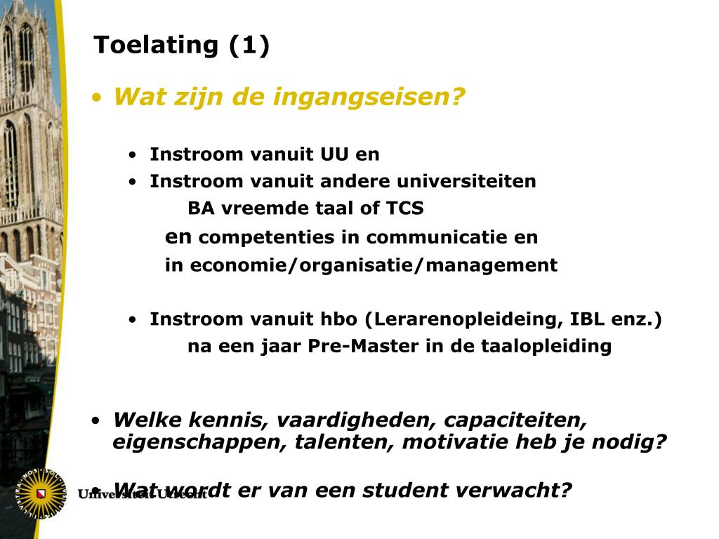 Toelating (1) • Wat zijn de ingangseisen? • Instroom vanuit UU en • Instroom vanuit andere universiteiten BA vreemde taal of TCS en competenties in communicatie en in economie/organisatie/management • Instroom vanuit hbo (Lerarenopleideing, IBL enz.) na een jaar Pre-Master in de taalopleiding • Welke kennis, vaardigheden, capaciteiten, eigenschappen, talenten, motivatie heb je nodig? • Wat wordt er van een student verwacht?
