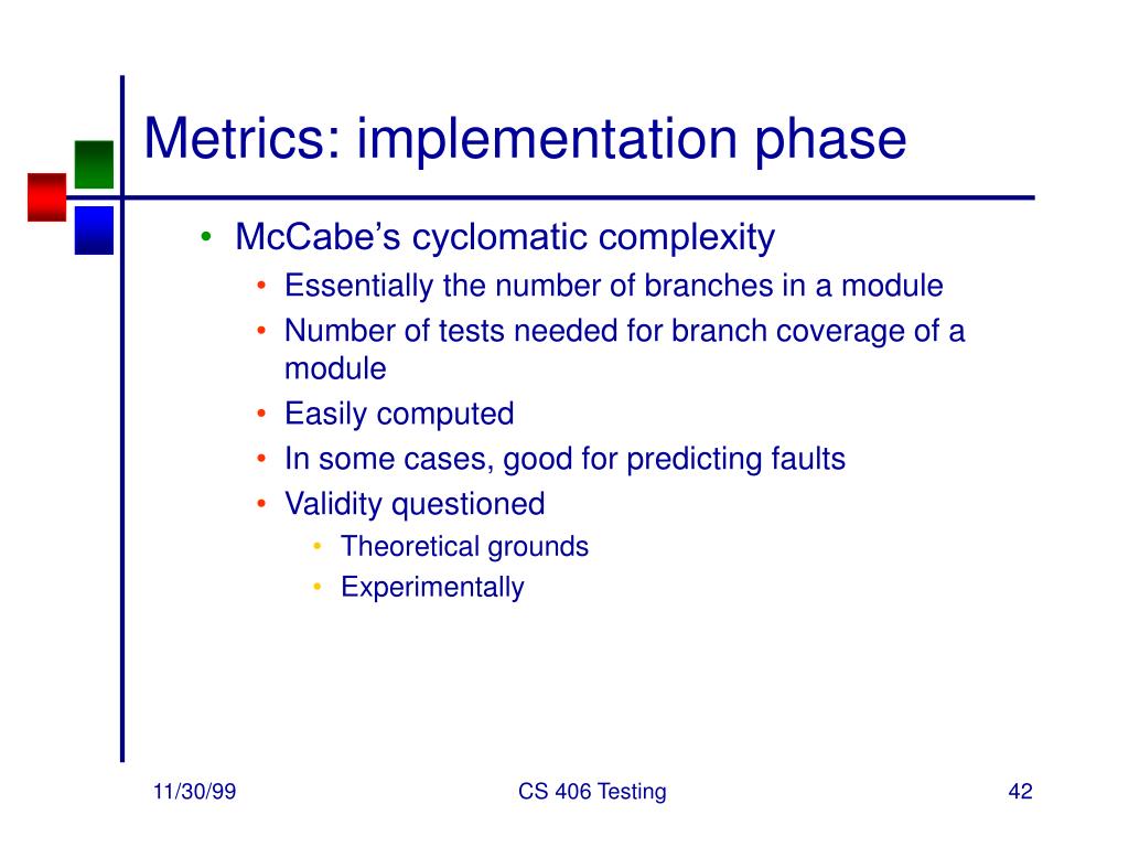 Metrics: implementation phase • McCabe’s cyclomatic complexity • Essentially the number of branches in a module • Number of tests needed for branch coverage of a module • Easily computed • In some cases, good for predicting faults • Validity questioned • Theoretical grounds • Experimentally CS 406 Testing