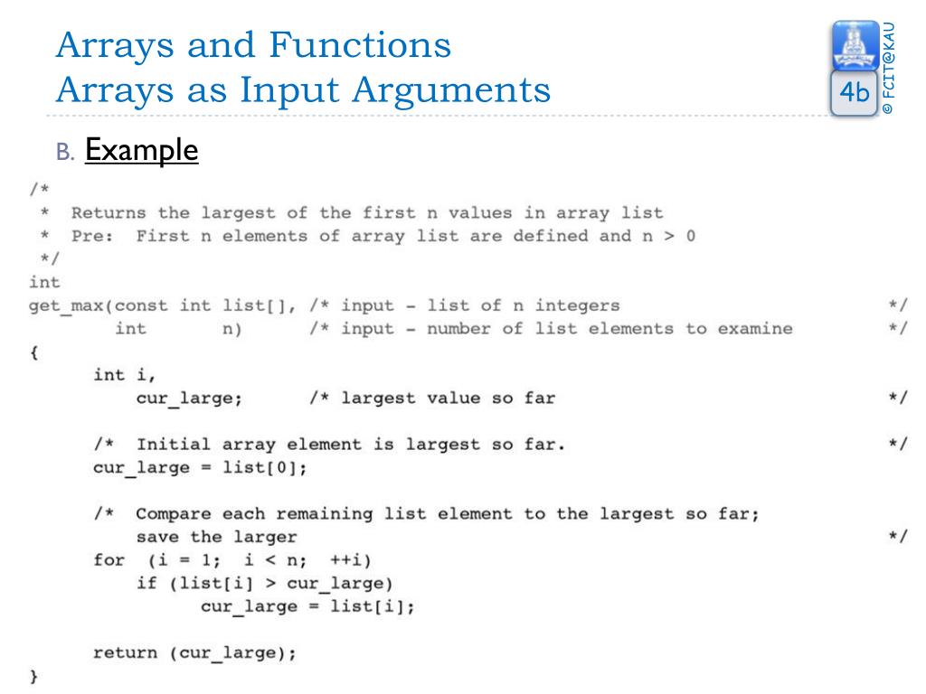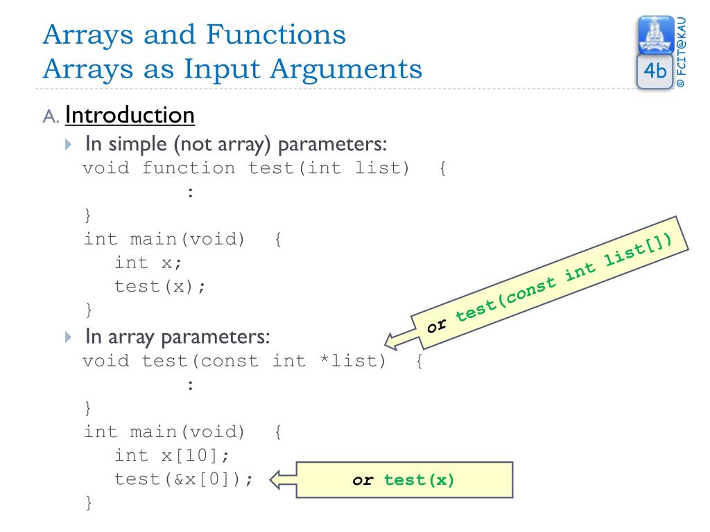 Arrays and FunctionsArrays as Input Arguments 4b or test(constint list[]) or test(x) • Introduction • In simple (not array) parameters: void function test(int list) { : }int main(void) {int x; test(x);} • In array parameters: void test(const int *list) { : }int main(void) {int x[10]; test(&x[0]);}