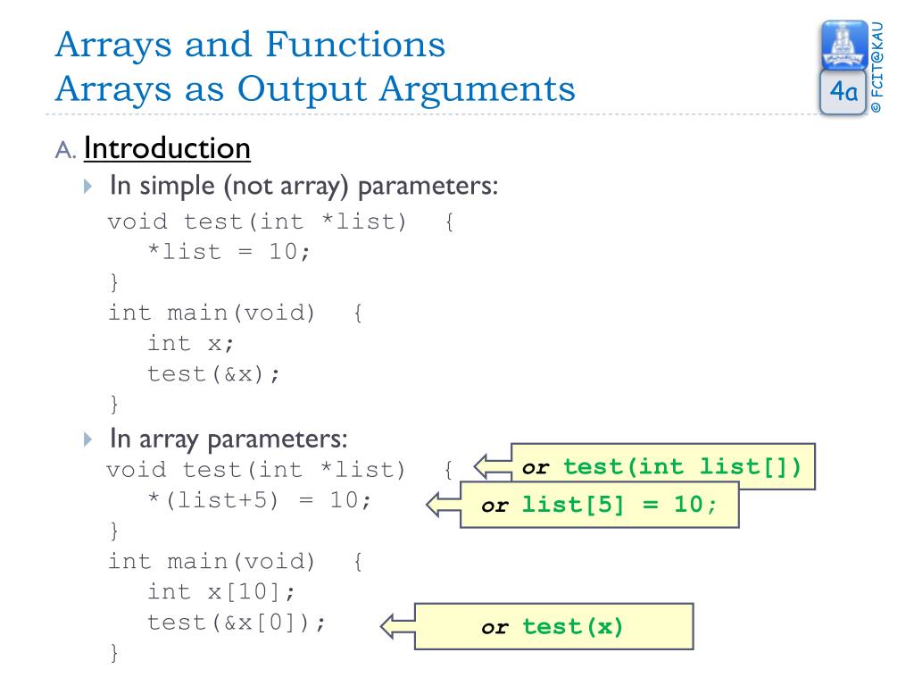 Arrays and FunctionsArrays as Output Arguments 4a ortest(int list[]) orlist[5] = 10; ortest(x) • Introduction • In simple (not array) parameters: void test(int *list) { *list = 10;}int main(void) {int x; test(&x);} • In array parameters: void test(int *list) {*(list+5) = 10;}int main(void) {int x[10]; test(&x[0]);}