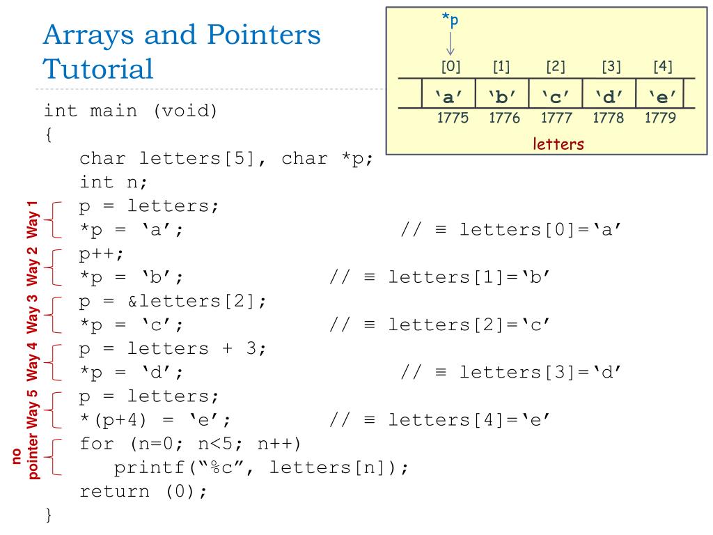 *p Arrays and PointersTutorial [0] [1] [2] [3] [4] ‘a’ ‘b’ ‘c’ ‘d’ ‘e’ 1775 1776 1777 1778 1779 letters Way 1 Way 2 Way 3 Way 4 Way 5 no pointer int main (void) { char letters[5], char *p;int n; p = letters; *p = ‘a’; // ≡ letters[0]=‘a’ p++; *p = ‘b’; // ≡ letters[1]=‘b’ p = &letters[2]; *p = ‘c’; // ≡ letters[2]=‘c’ p = letters + 3; *p = ‘d’; // ≡ letters[3]=‘d’ p = letters; *(p+4) = ‘e’; // ≡ letters[4]=‘e’ for (n=0; n<5; n++) printf(“%c”, letters[n]); return (0); }