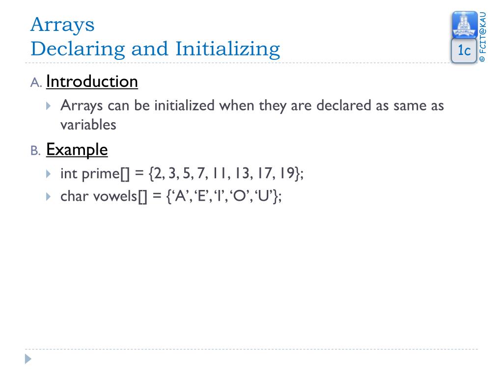 ArraysDeclaring and Initializing 1c • Introduction • Arrays can be initialized when they are declared as same as variables • Example • int prime[] = {2, 3, 5, 7, 11, 13, 17, 19}; • char vowels[] = {‘A’, ‘E’, ‘I’, ‘O’, ‘U’};
