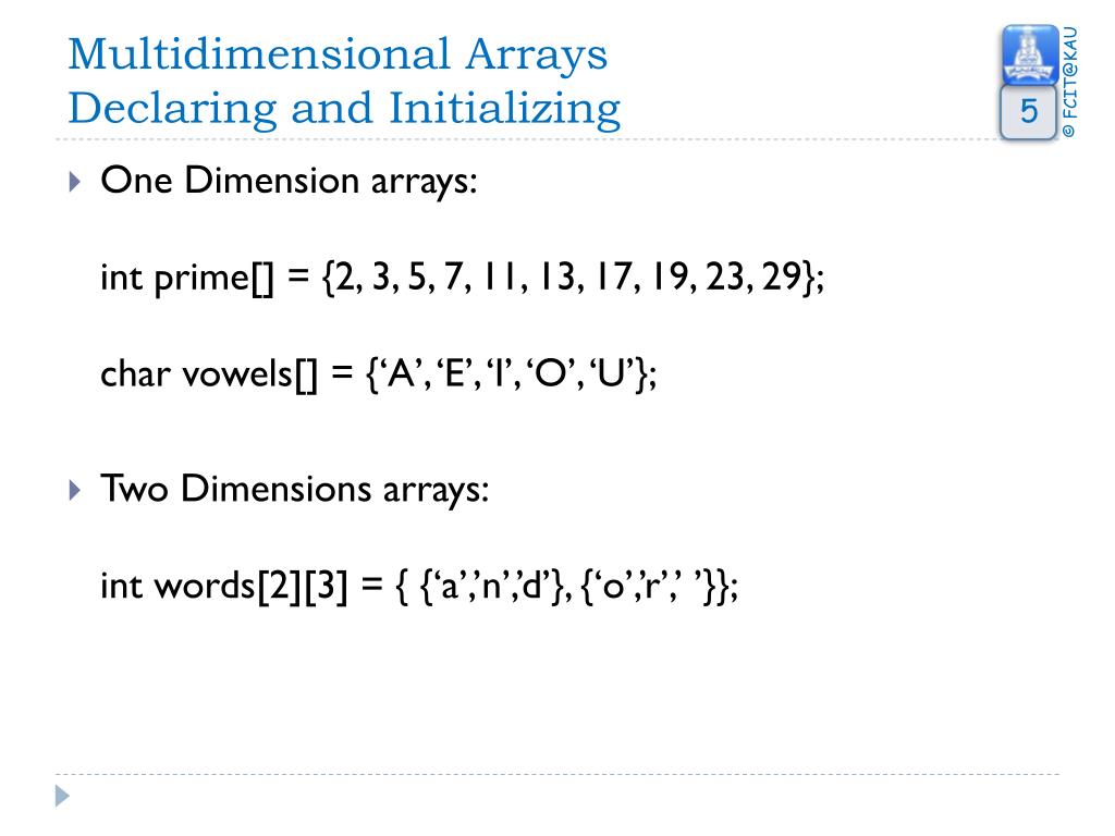 Multidimensional ArraysDeclaring and Initializing 5 One Dimension arrays:int prime[] = {2, 3, 5, 7, 11, 13, 17, 19, 23, 29};char vowels[] = {‘A’, ‘E’, ‘I’, ‘O’, ‘U’}; Two Dimensions arrays:int words[2][3] = { {‘a’,’n’,’d’}, {‘o’,’r’,’ ’}};