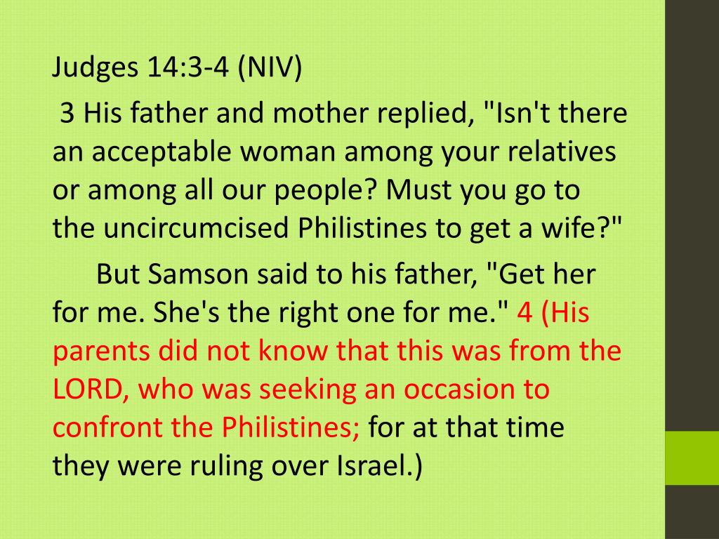 Judges 14:3-4 (NIV) 3 His father and mother replied, "Isn't there an acceptable woman among your relatives or among all our people? Must you go to the uncircumcised Philistines to get a wife?" But Samson said to his father, "Get her for me. She's the right one for me." 4 (His parents did not know that this was from the LORD, who was seeking an occasion to confront the Philistines; for at that time they were ruling over Israel.)