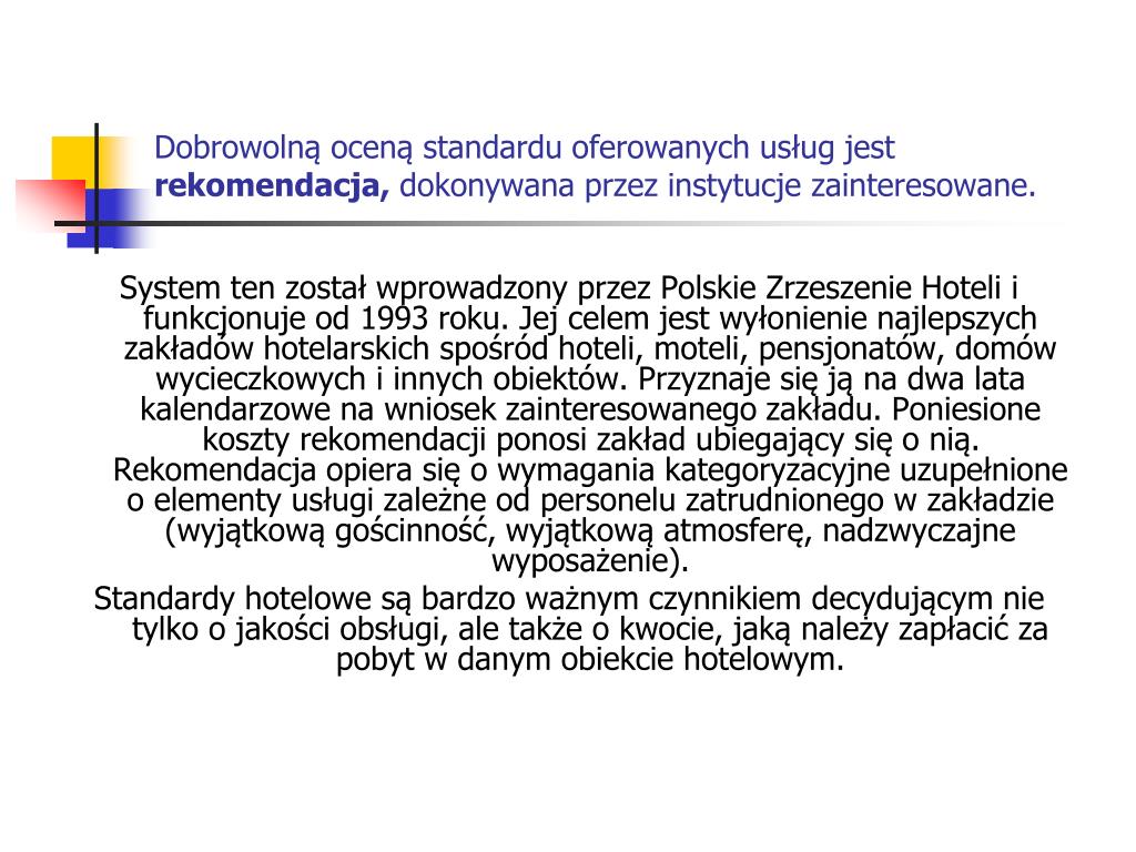 Dobrowolną oceną standardu oferowanych usług jest rekomendacja, dokonywana przez instytucje zainteresowane. System ten został wprowadzony przez Polskie Zrzeszenie Hoteli i funkcjonuje od 1993 roku. Jej celem jest wyłonienie najlepszych zakładów hotelarskich spośród hoteli, moteli, pensjonatów, domów wycieczkowych i innych obiektów. Przyznaje się ją na dwa lata kalendarzowe na wniosek zainteresowanego zakładu. Poniesione koszty rekomendacji ponosi zakład ubiegający się o nią. Rekomendacja opiera się o wymagania kategoryzacyjne uzupełnione o elementy usługi zależne od personelu zatrudnionego w zakładzie (wyjątkową gościnność, wyjątkową atmosferę, nadzwyczajne wyposażenie). Standardy hotelowe są bardzo ważnym czynnikiem decydującym nie tylko o jakości obsługi, ale także o kwocie, jaką należy zapłacić za pobyt w danym obiekcie hotelowym.