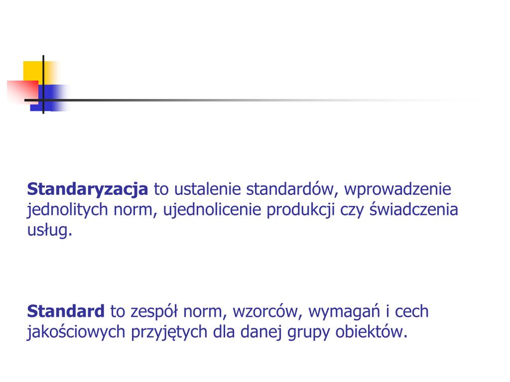 Standaryzacja to ustalenie standardów, wprowadzenie jednolitych norm, ujednolicenie produkcji czy świadczenia usług.Standard to zespół norm, wzorców, wymagań i cech jakościowych przyjętych dla danej grupy obiektów.