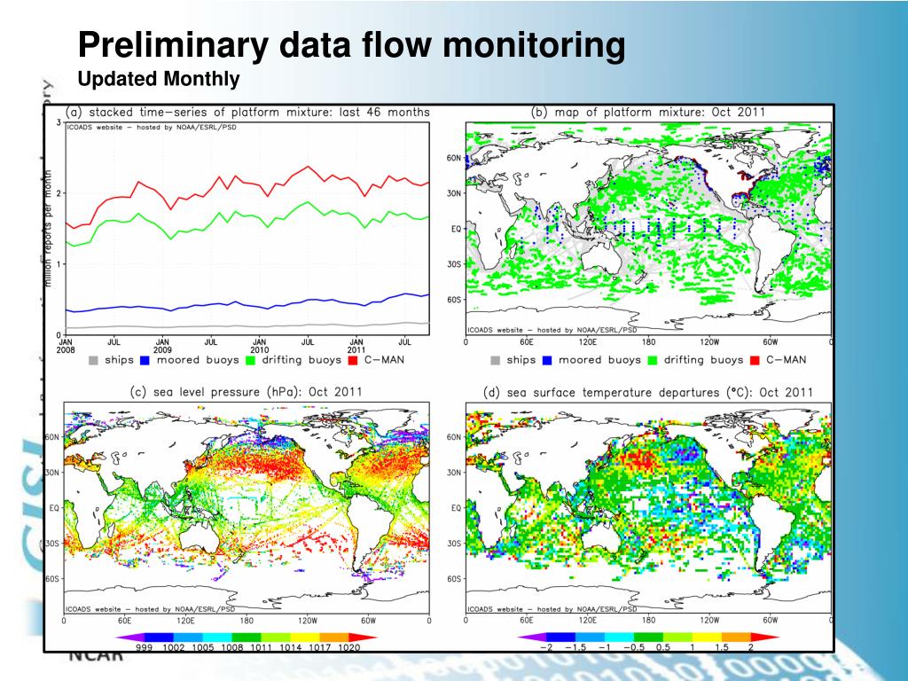 Development of Bias-free Global Marine Data • New Project • Partners: NCAR, NOAA (ESRL, NCDC), Florida State University • ICOADS Value-Added Database (IVAD) • http://icoads.noaa.gov/ivad/ • Project aim: to trace value-added improvements back to individual ICOADS observations • How: • Establish a DBMS to support development of value-added records and facilitate user access • Implement modifications to the International Maritime Meteorological Archive (IMMA) data format • Scientifically demonstrate the impact of value-added records on air-sea flux estimates