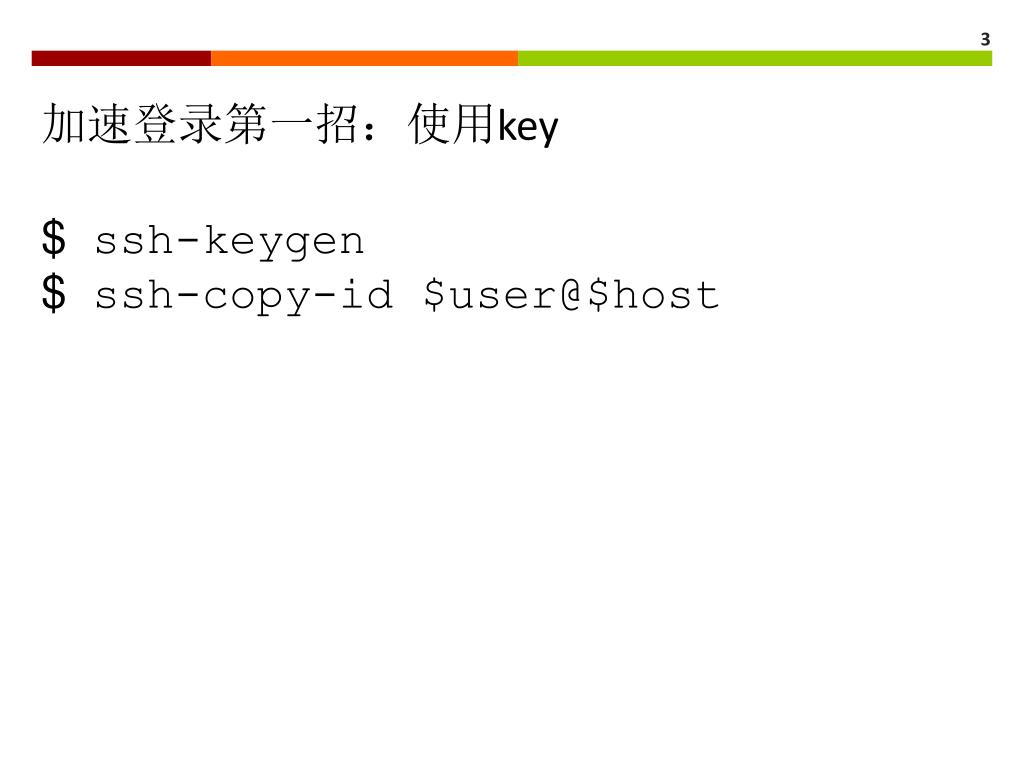 加速登录第一招:使用key • ssh-keygen • ssh-copy-id $user@$host