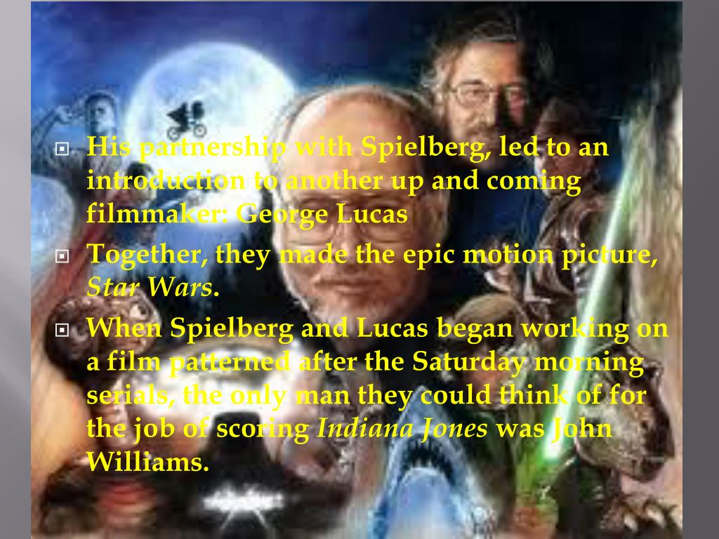 His partnership with Spielberg, led to an introduction to another up and coming filmmaker: George Lucas • Together, they made the epic motion picture, Star Wars. • When Spielberg and Lucas began working on a film patterned after the Saturday morning serials, the only man they could think of for the job of scoring Indiana Jones was John Williams.