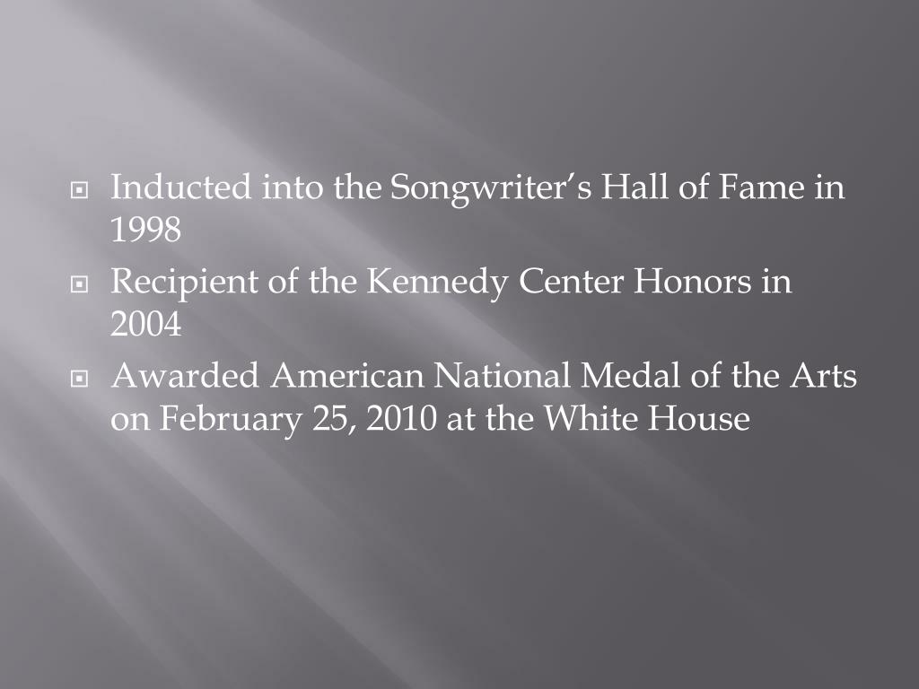Inducted into the Songwriter’s Hall of Fame in 1998 • Recipient of the Kennedy Center Honors in 2004 • Awarded American National Medal of the Arts on February 25, 2010 at the White House