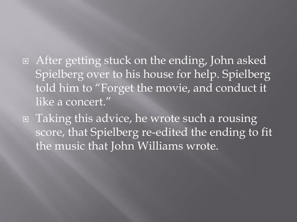 After getting stuck on the ending, John asked Spielberg over to his house for help. Spielberg told him to “Forget the movie, and conduct it like a concert.” • Taking this advice, he wrote such a rousing score, that Spielberg re-edited the ending to fit the music that John Williams wrote.