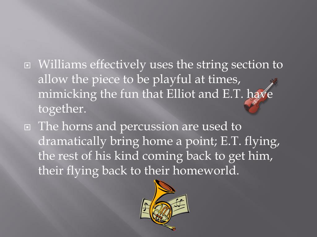 Williams effectively uses the string section to allow the piece to be playful at times, mimicking the fun that Elliot and E.T. have together. • The horns and percussion are used to dramatically bring home a point; E.T. flying, the rest of his kind coming back to get him, their flying back to their homeworld.