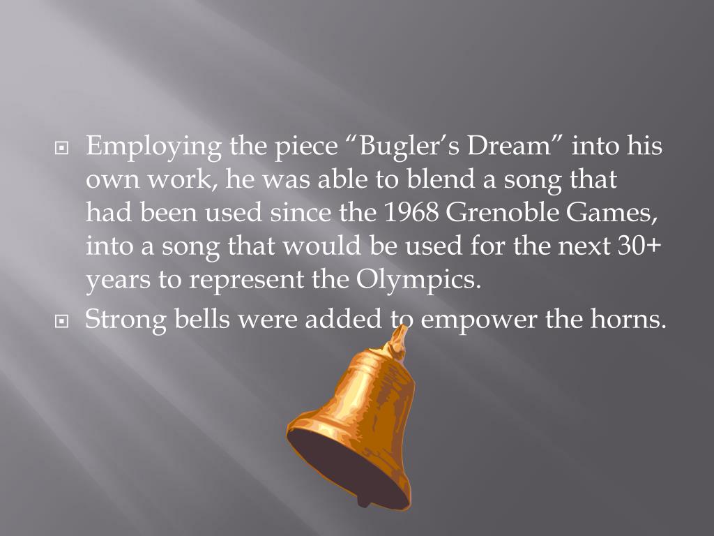 Employing the piece “Bugler’s Dream” into his own work, he was able to blend a song that had been used since the 1968 Grenoble Games, into a song that would be used for the next 30+ years to represent the Olympics. • Strong bells were added to empower the horns.