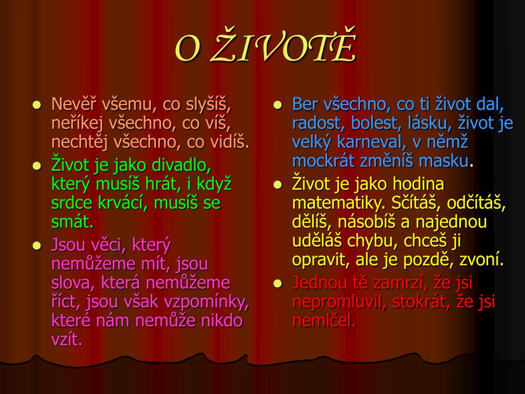 Nevěř všemu, co slyšíš, neříkej všechno, co víš, nechtěj všechno, co vidíš. Život je jako divadlo, který musíš hrát, i když srdce krvácí, musíš se smát. Jsou věci, který nemůžeme mít, jsou slova, která nemůžeme říct, jsou však vzpomínky, které nám nemůže nikdo vzít. Ber všechno, co ti život dal, radost, bolest, lásku, život je velký karneval, v němž mockrát změníš masku. Život je jako hodina matematiky. Sčítáš, odčítáš, dělíš, násobíš a najednou uděláš chybu, chceš jiopravit, ale je pozdě, zvoní. Jednou tě zamrzí, že jsi nepromluvil, stokrát, že jsi nemlčel. O ŽIVOTĚ
