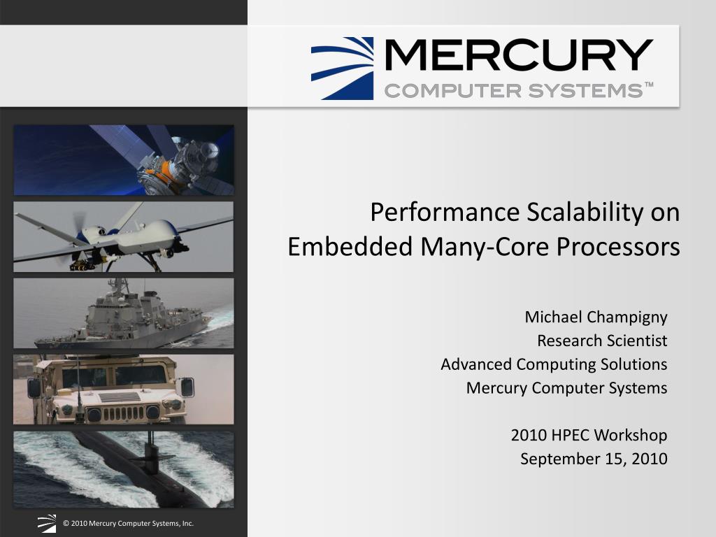 Performance Scalability on Embedded Many-Core Processors. Michael Champigny Research Scientist Advanced Computing Solutions Mercury Computer Systems 2010 HPEC Workshop September 15, 2010. Outline. Motivation Single-chip parallelism and convergence Variability challenges