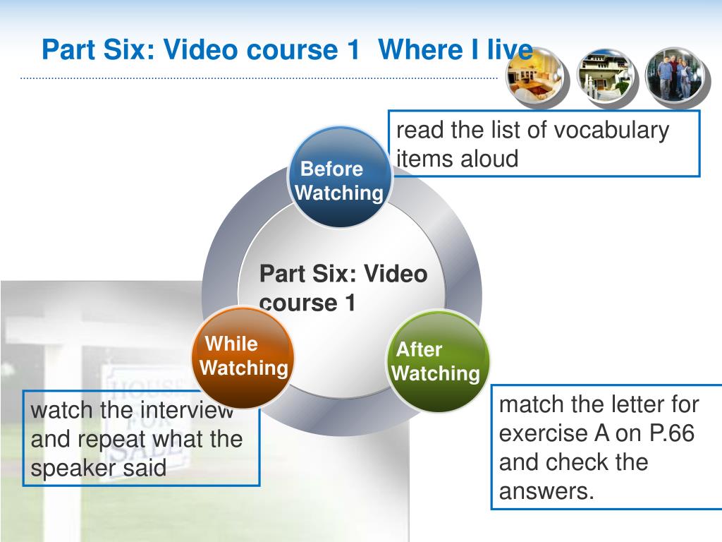 Part Six: Video course 1 Where I live read the list of vocabulary items aloud Before Watching Part Six: Video course 1 While Watching After Watching match the letter for exercise A on P.66 and check the answers. watch the interview and repeat what the speaker said