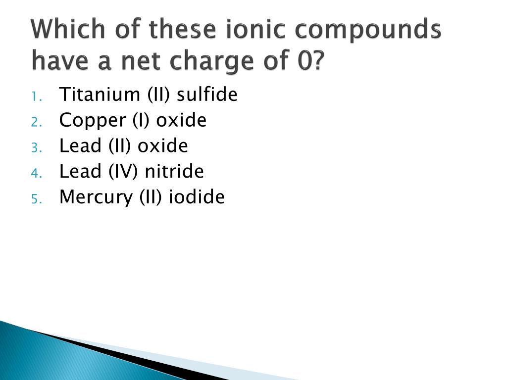 Which of these ionic compounds have a net charge of 0? • **Titanium (II) sulfide +2-2=0 • Copper (I) oxide +1-2=-1 • **Lead (II) oxide +2-2=0 • Lead (IV) nitride +4-3=+1 • Mercury (II) iodide +2-1=+1