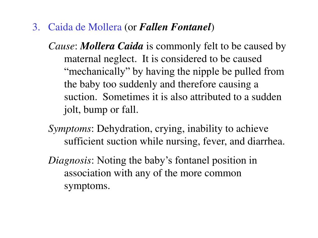 3. Caida de Mollera (or Fallen Fontanel) • Cause: Mollera Caida is commonly felt to be caused by maternal neglect. It is considered to be caused “mechanically” by having the nipple be pulled from the baby too suddenly and therefore causing a suction. Sometimes it is also attributed to a sudden jolt, bump or fall. • Symptoms: Dehydration, crying, inability to achieve sufficient suction while nursing, fever, and diarrhea. • Diagnosis: Noting the baby’s fontanel position in association with any of the more common symptoms.