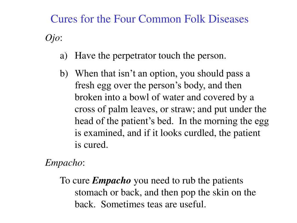 Cures for the Four Common Folk Diseases • Ojo: • Have the perpetrator touch the person. • When that isn’t an option, you should pass a fresh egg over the person’s body, and then broken into a bowl of water and covered by a cross of palm leaves, or straw; and put under the head of the patient’s bed. In the morning the egg is examined, and if it looks curdled, the patient is cured. • Empacho: • To cure Empacho you need to rub the patients stomach or back, and then pop the skin on the back. Sometimes teas are useful.