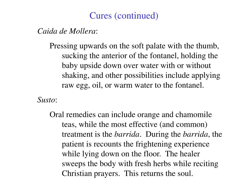 Cures (continued) • Caida de Mollera: • Pressing upwards on the soft palate with the thumb, sucking the anterior of the fontanel, holding the baby upside down over water with or without shaking, and other possibilities include applying raw egg, oil, or warm water to the fontanel. • Susto: • Oral remedies can include orange and chamomile teas, while the most effective (and common) treatment is the barrida. During the barrida, the patient is recounts the frightening experience while lying down on the floor. The healer sweeps the body with fresh herbs while reciting Christian prayers. This returns the soul.
