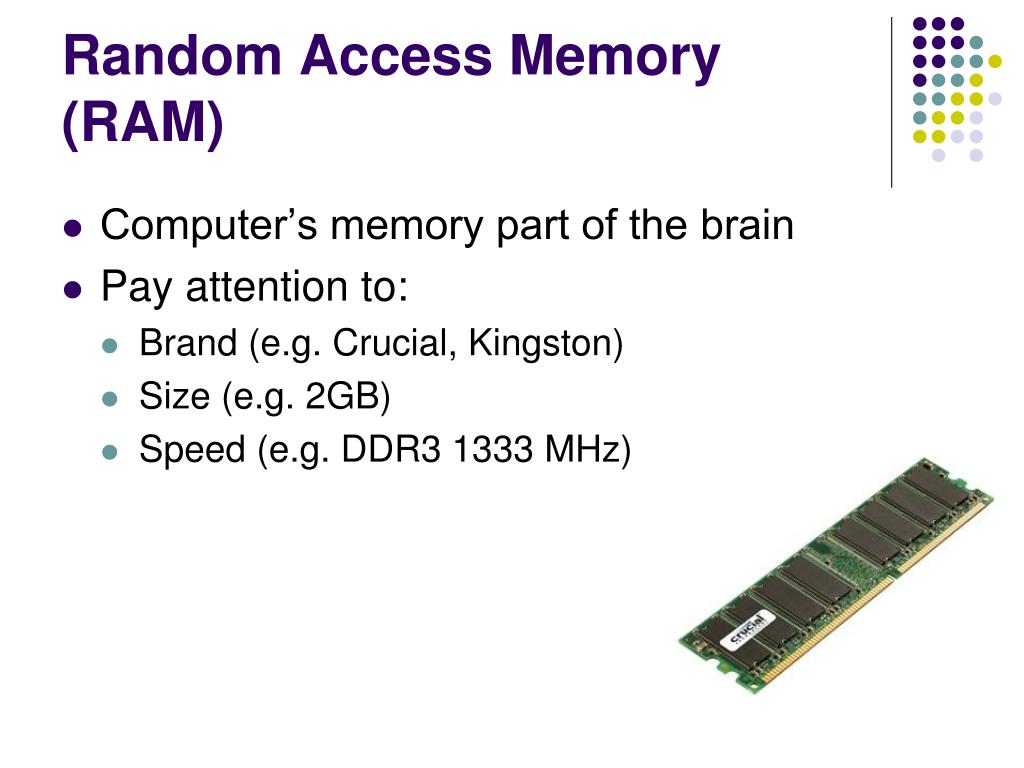 Random Access Memory (RAM) • Computer’s memory part of the brain • Pay attention to: • Brand (e.g. Crucial, Kingston) • Size (e.g. 2GB) • Speed (e.g. DDR3 1333 MHz)