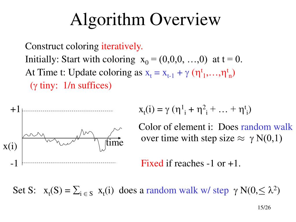 +1 time -1 Algorithm Overview Construct coloring iteratively. Initially: Start with coloring x0 = (0,0,0, …,0) at t = 0. At Time t: Update coloring as xt = xt-1 + (t1,…,tn) ( tiny: 1/n suffices) xt(i) = (1i + 2i + … + ti) Color of element i: Does random walk over time with step size ¼ N(0,1) x(i) Fixed if reaches -1 or +1. Set S: xt(S) = i 2 S xt(i) does a random walk w/ step N(0,·2)