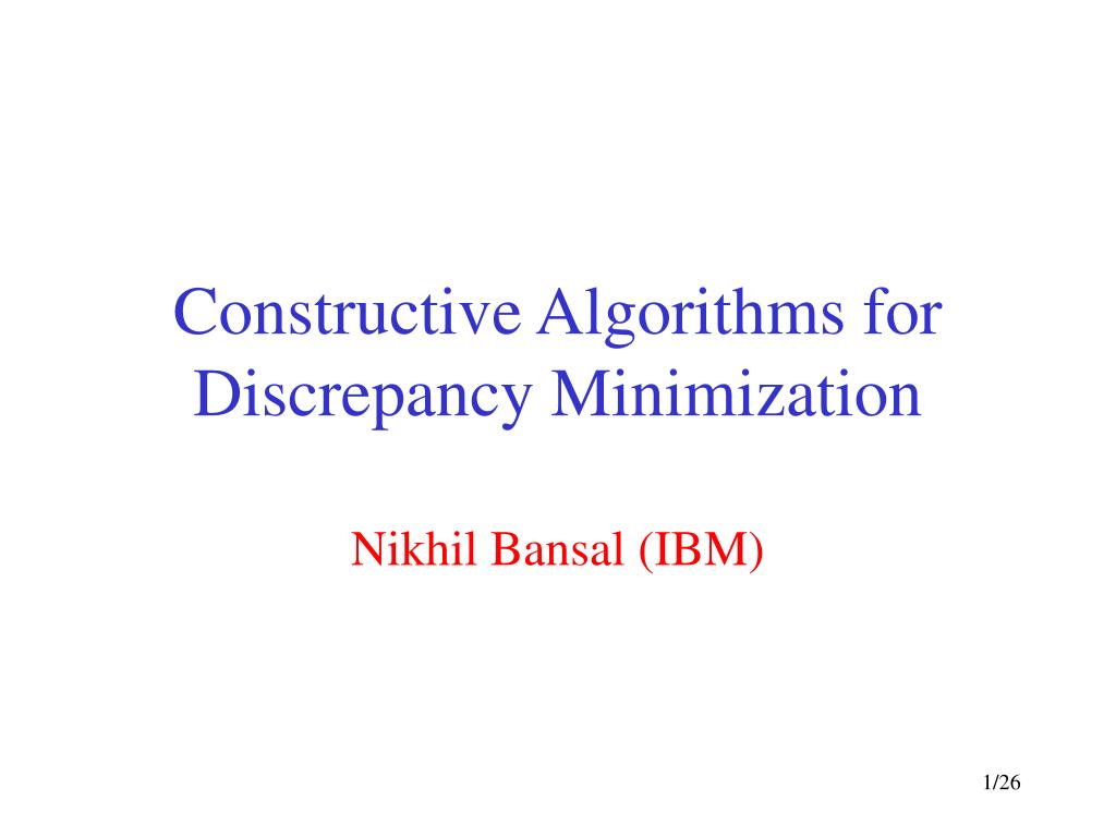 Constructive Algorithms for Discrepancy Minimization. Nikhil Bansal (IBM). S 3. S 4. S 1. S 2. Combinatorial Discrepancy. Universe: U= [1,…,n] Subsets: S 1 ,S 2 ,…,S m Color elements red/blue so each set is colored as evenly as possible. Applications.