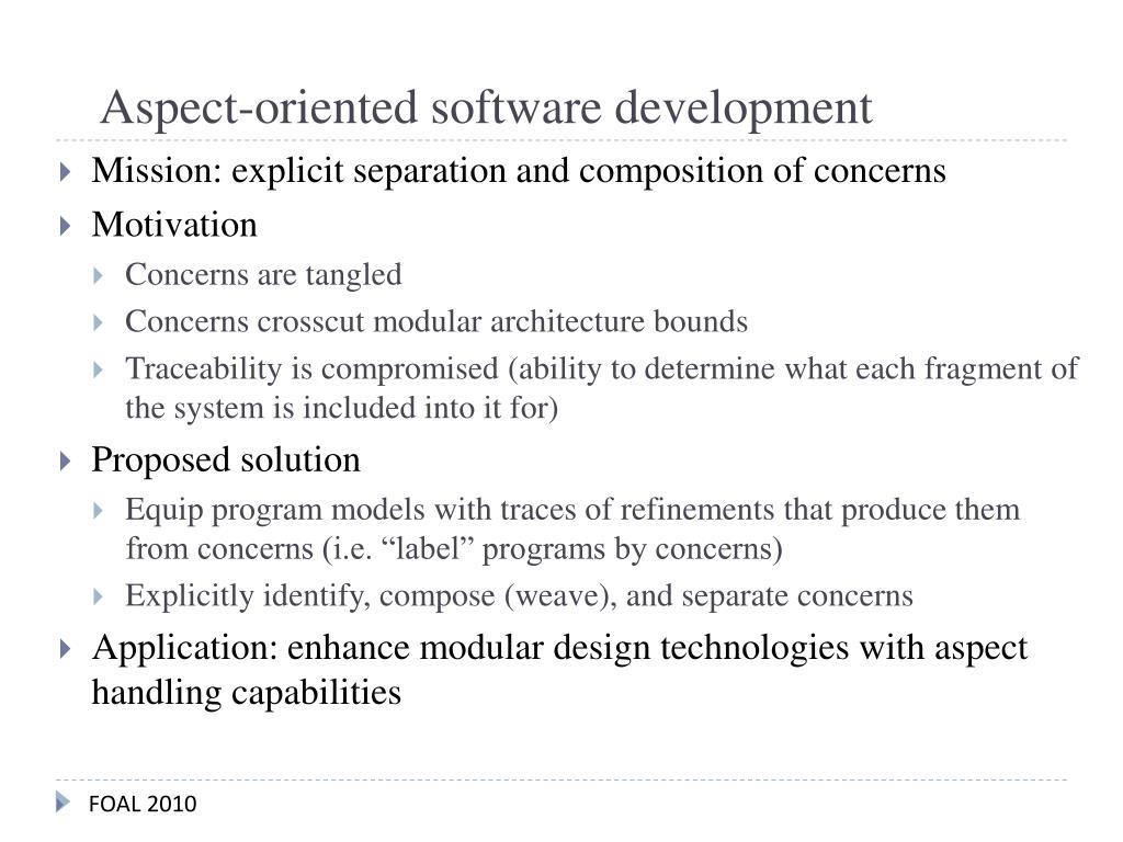 Aspect-oriented software development • Mission: explicit separation and composition of concerns • Motivation • Concerns are tangled • Concerns crosscut modular architecture bounds • Traceability is compromised (ability to determine what each fragment of the system is included into it for) • Proposed solution • Equip program models with traces of refinements that produce them from concerns (i.e. “label” programs by concerns) • Explicitly identify, compose (weave), and separate concerns • Application: enhance modular design technologies with aspect handling capabilities • FOAL 2010