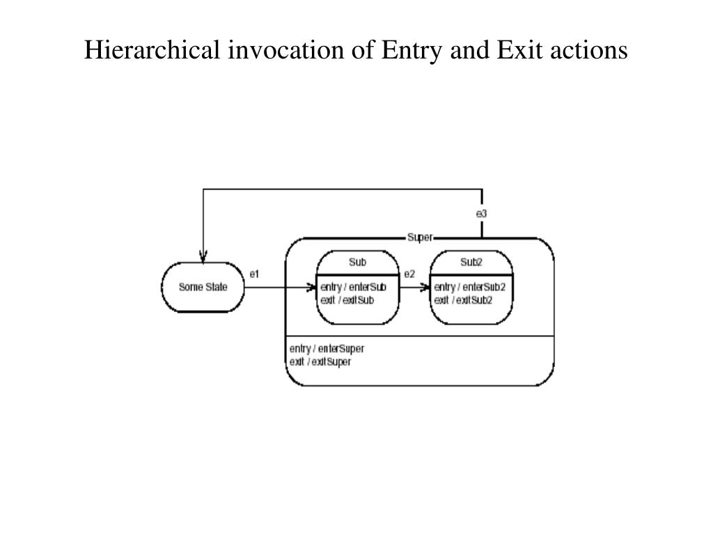 Transition notation State lists logCard logCard alternative choice Idle Req(Id) sequence of actions [ID>10] [ID<=10] MinorReq=Id; MajorReq=Id; Major(Id) Minor(Id) Busy VerifyCard Logged ReleaseCard Example: Notation Enhancements VerifyCard, ReleaseCard Logged Is a notational shorthand for