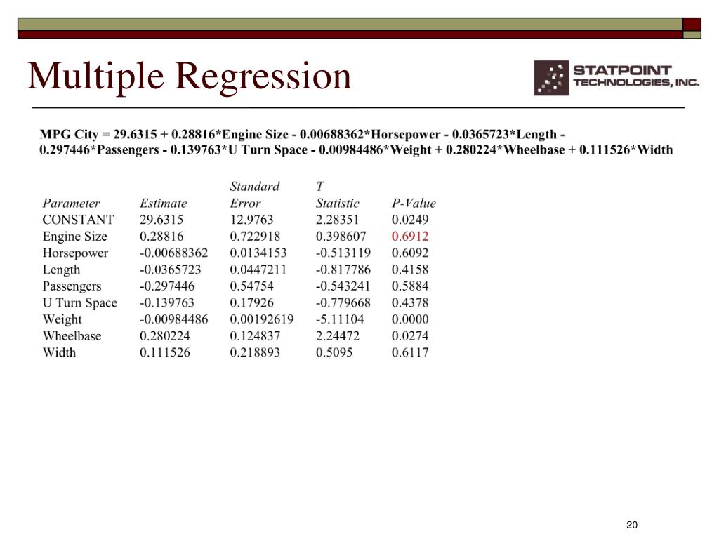 Reduced Models MPG City = 29.9911 - 0.0103886*Weight + 0.233751*Wheelbase (R2=73.0%) MPG City = 64.1402 - 0.054462*Horsepower - 1.56144*Passengers - 0.374767*Width (R2=64.3%)