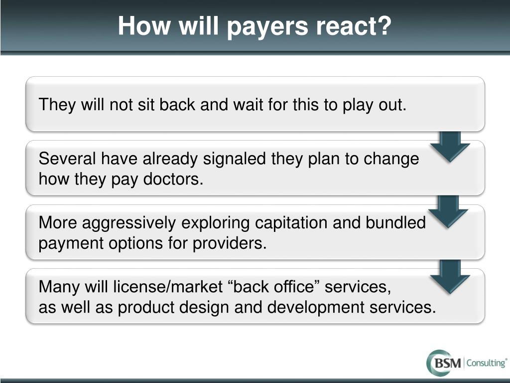 How will payers react? They will not sit back and wait for this to play out. Several have already signaled they plan to change how they pay doctors. More aggressively exploring capitation and bundled payment options for providers. Many will license/market “back office” services, as well as product design and development services.