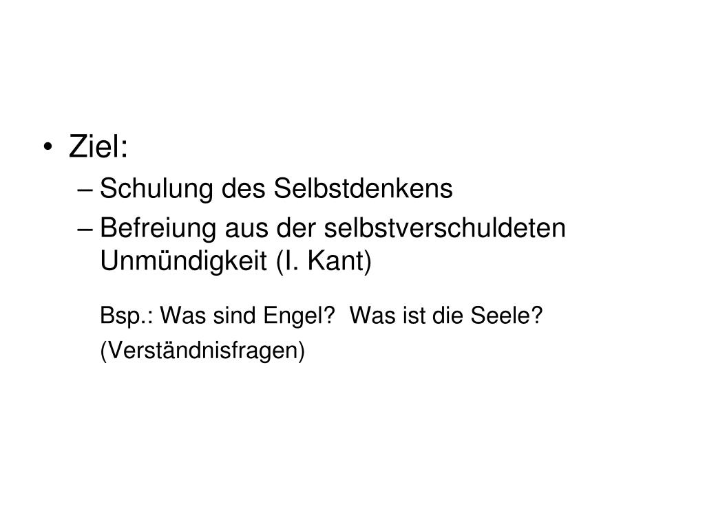 Ziel: • Schulung des Selbstdenkens • Befreiung aus der selbstverschuldeten Unmündigkeit (I. Kant) Bsp.: Was sind Engel? Was ist die Seele? (Verständnisfragen)