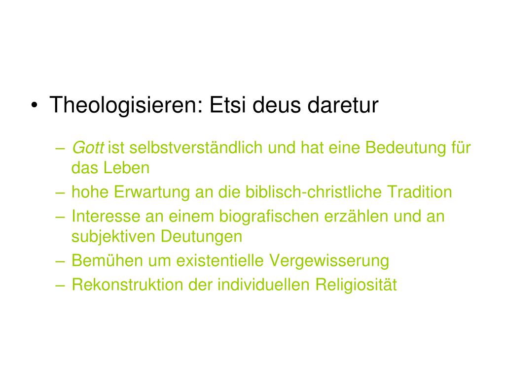 Theologisieren: Etsi deus daretur • Gott ist selbstverständlich und hat eine Bedeutung für das Leben • hohe Erwartung an die biblisch-christliche Tradition • Interesse an einem biografischen erzählen und an subjektiven Deutungen • Bemühen um existentielle Vergewisserung • Rekonstruktion der individuellen Religiosität