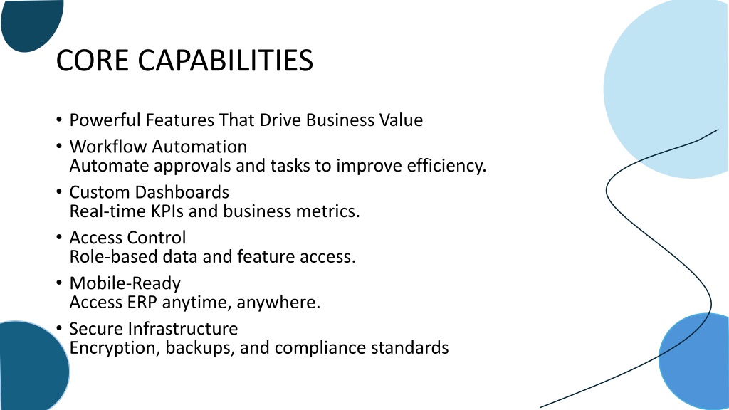 CORE CAPABILITIES • Powerful Features That Drive Business Value • Workflow AutomationAutomate approvals and tasks to improve efficiency. • Custom DashboardsReal-time KPIs and business metrics. • Access ControlRole-based data and feature access. • Mobile-ReadyAccess ERP anytime, anywhere. • Secure InfrastructureEncryption, backups, and compliance standards