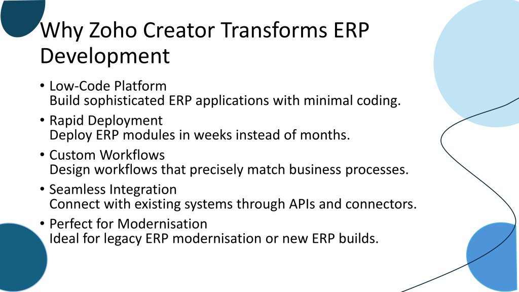 Why Zoho Creator Transforms ERP Development • Low-Code PlatformBuild sophisticated ERP applications with minimal coding. • Rapid DeploymentDeploy ERP modules in weeks instead of months. • Custom WorkflowsDesign workflows that precisely match business processes. • Seamless IntegrationConnect with existing systems through APIs and connectors. • Perfect for ModernisationIdeal for legacy ERP modernisation or new ERP builds.