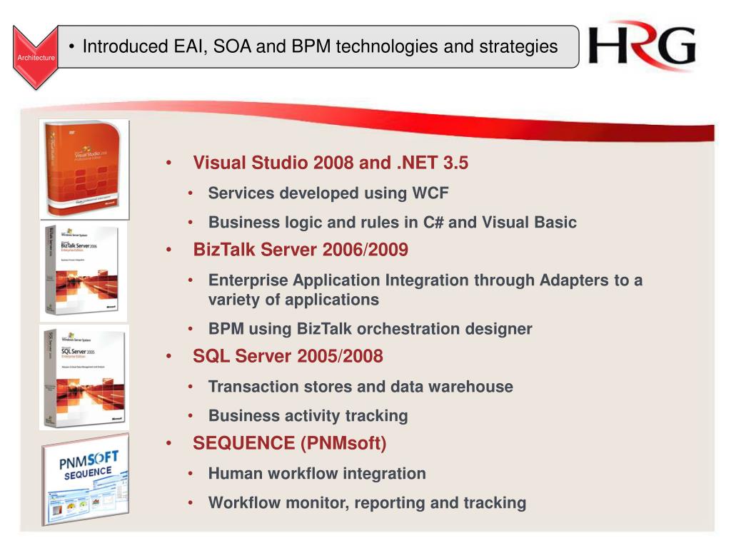 Visual Studio 2008 and .NET 3.5 • Services developed using WCF • Business logic and rules in C# and Visual Basic • BizTalk Server 2006/2009 • Enterprise Application Integration through Adapters to a variety of applications • BPM using BizTalk orchestration designer • SQL Server 2005/2008 • Transaction stores and data warehouse • Business activity tracking • SEQUENCE (PNMsoft) • Human workflow integration • Workflow monitor, reporting and tracking