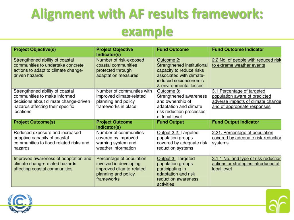 Important steps in project development • Acquiring adequate information about the adaptation challenge and other factors • Ensuring alignment with national strategies and plans • Avoiding overlap with other similar projects • Ensuring alignment with AF results framework • Adequate consultations with vulnerable communities and women (for full proposal)