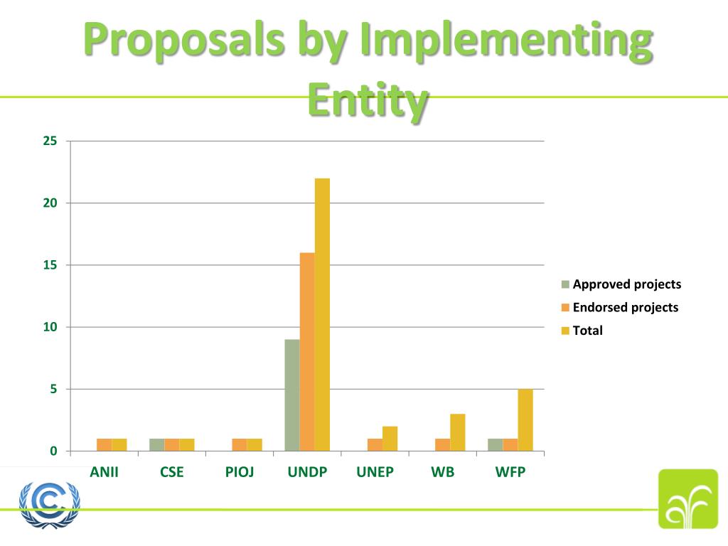 LESSONS LEARNED (2) • NIEs have a very low share of the proposals submitted; • More NIEs are being accredited; • Accreditation Toolkit; • Cap of 50% on MIEs. • UNDP = 63% of all proposals submitted; • Only 4 out of 9 MIEs have submitted proposals: lack of experience, interest, or willingness to give NIEs their chance? • Need for more guidance on AF projects/programmes review criteria?