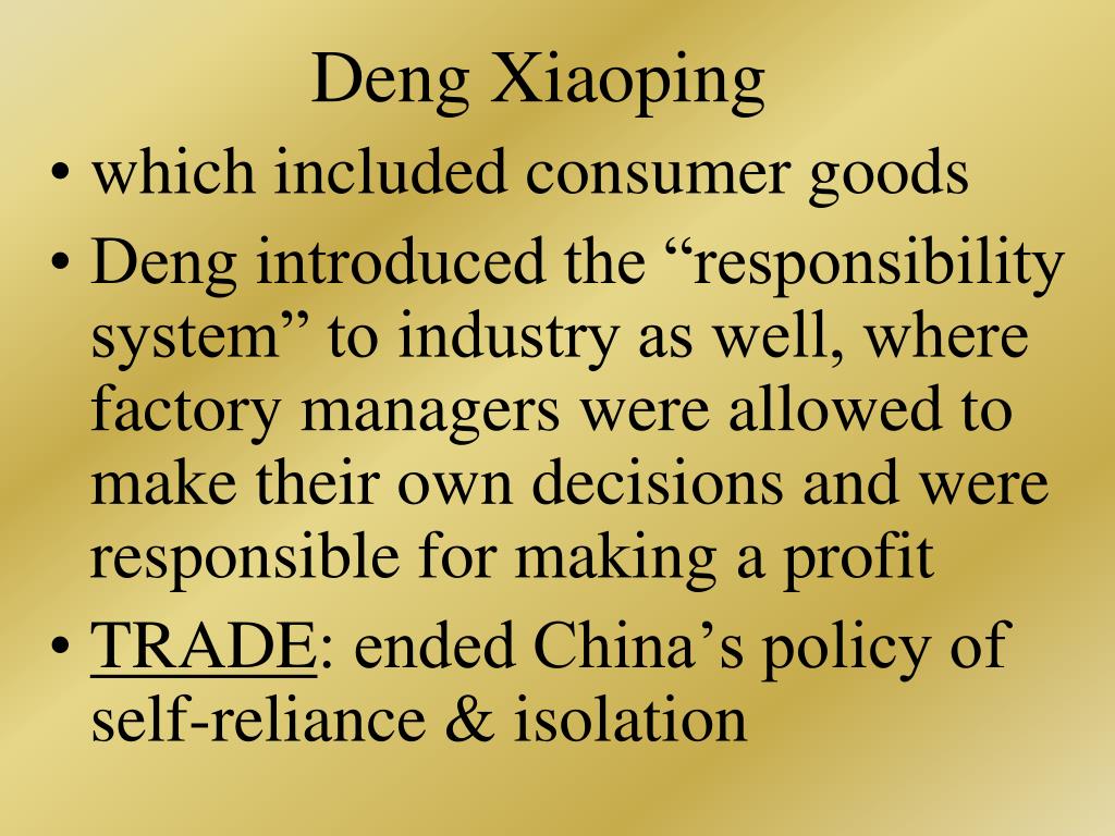 Deng Xiaoping • which included consumer goods • Deng introduced the “responsibility system” to industry as well, where factory managers were allowed to make their own decisions and were responsible for making a profit • TRADE: ended China’s policy of self-reliance & isolation