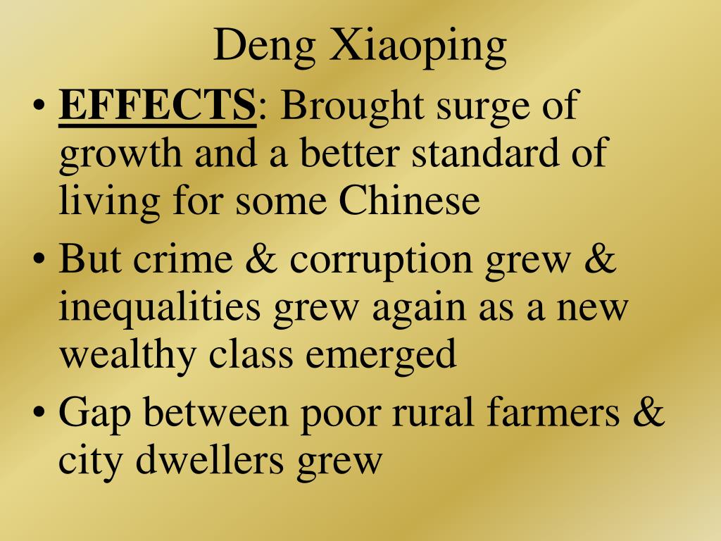 Deng Xiaoping • EFFECTS: Brought surge of growth and a better standard of living for some Chinese • But crime & corruption grew & inequalities grew again as a new wealthy class emerged • Gap between poor rural farmers & city dwellers grew