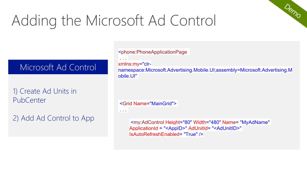 Demo Adding the Microsoft Ad Control <phone:PhoneApplicationPage . . . xmlns:my="clr-namespace:Microsoft.Advertising.Mobile.UI;assembly=Microsoft.Advertising.Mobile.UI" Microsoft Ad Control 1) Create Ad Units in PubCenter 2) Add Ad Control to App <Grid Name="MainGrid"> . . . <my:AdControl Height="80" Width="480" Name="MyAdName"ApplicationId ="<AppID>"AdUnitId="<AdUnitID>"IsAutoRefreshEnabled="True"/>