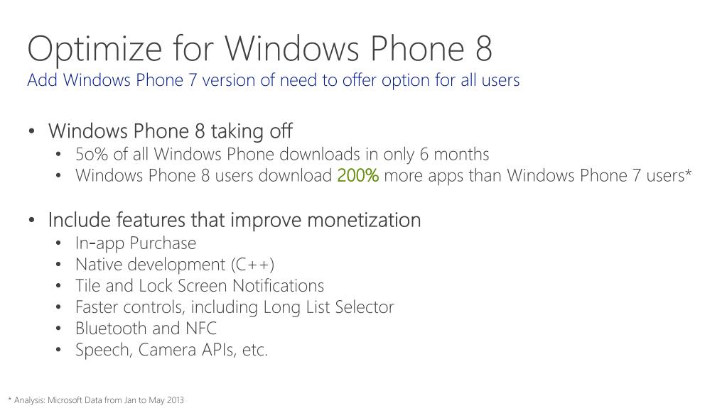 Optimize for Windows Phone 8Add Windows Phone 7 version of need to offer option for all users • Windows Phone 8 taking off • 5o% of all Windows Phone downloads in only 6 months • Windows Phone 8 users download 200% more apps than Windows Phone 7 users* • Include features that improve monetization • In-app Purchase • Native development (C++) • Tile and Lock Screen Notifications • Faster controls, including Long List Selector • Bluetooth and NFC • Speech, Camera APIs, etc. * Analysis: Microsoft Data from Jan to May 2013