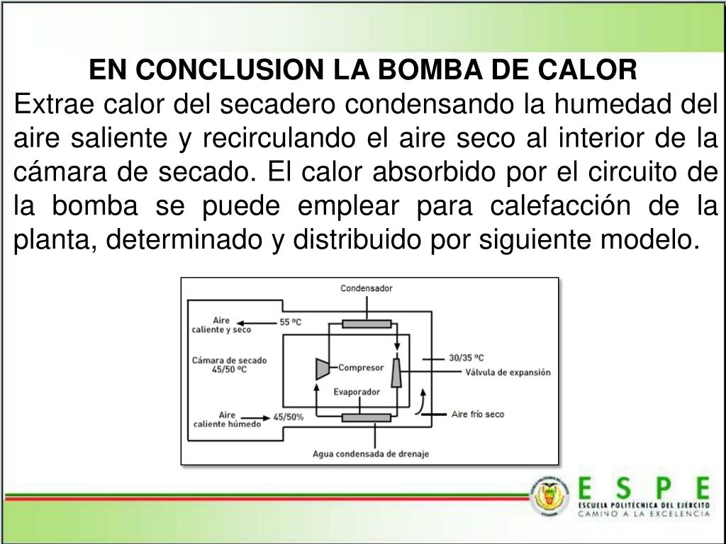 EN CONCLUSION LA BOMBA DE CALOR Extrae calor del secadero condensando la humedad del aire saliente y recirculando el aire seco al interior de la cámara de secado. El calor absorbido por el circuito de la bomba se puede emplear para calefacción de la planta, determinado y distribuido por siguiente modelo.