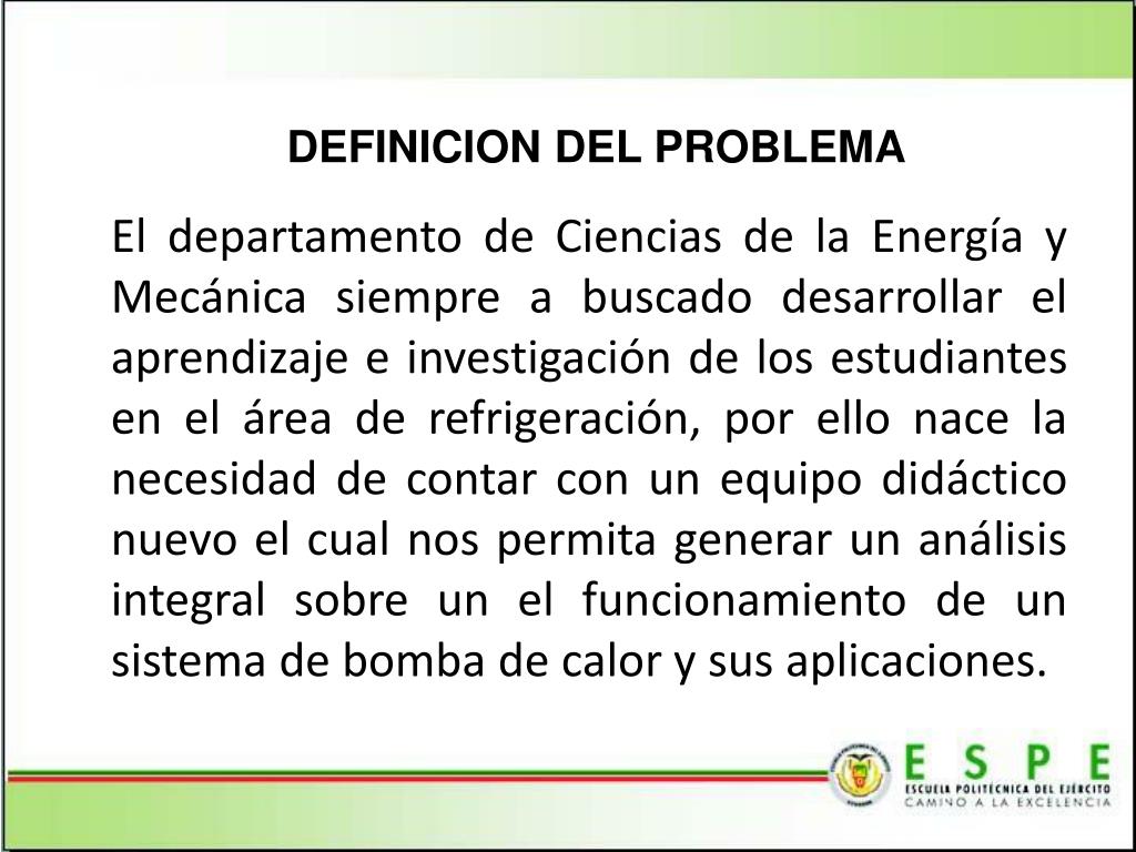 DEFINICION DEL PROBLEMA El departamento de Ciencias de la Energía y Mecánica siempre a buscado desarrollar el aprendizaje e investigación de los estudiantes en el área de refrigeración, por ello nace la necesidad de contar con un equipo didáctico nuevo el cual nos permita generar un análisis integral sobre un el funcionamiento de un sistema de bomba de calor y sus aplicaciones.