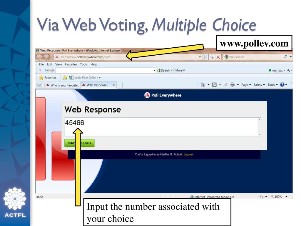 Poll Everywhere, Multiple Choice Number Included in Text Message Contact number you Text to OR you may vote online on the Web. Copy and paste the link into web browser and vote!