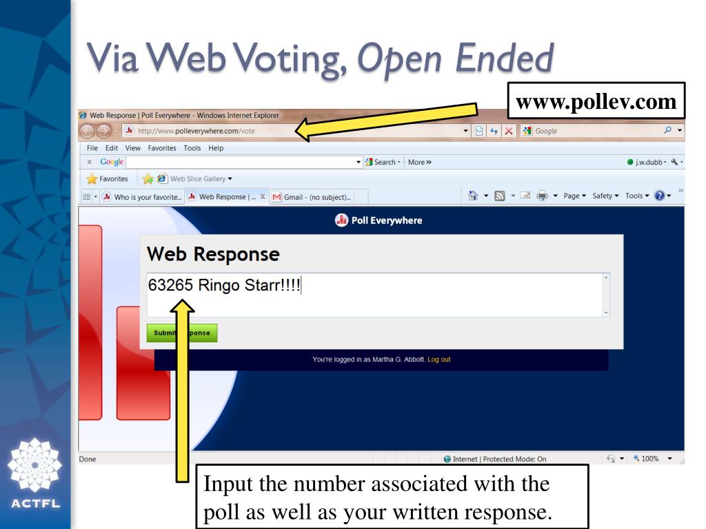 Poll Everywhere, Open Ended Number Included in Text Message Contact number you Text to OR you may vote online on the Web. Copy and paste the link into web browser and vote!