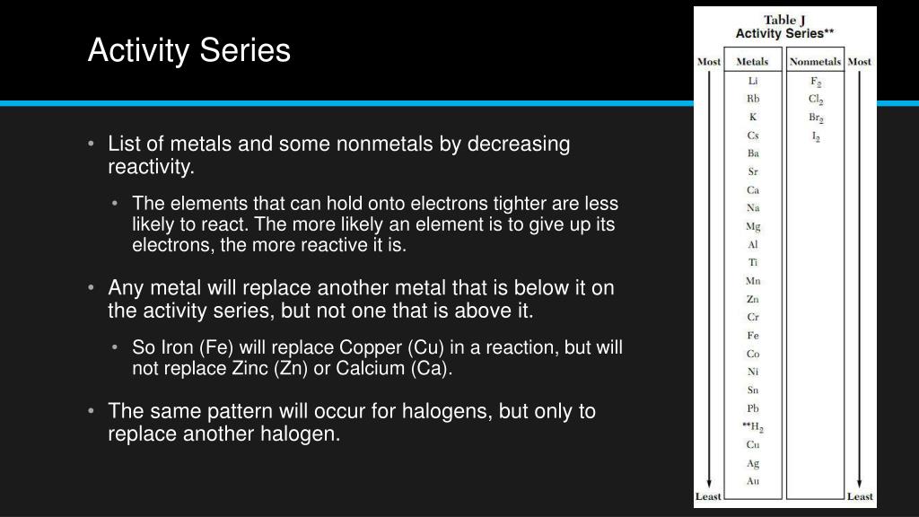 Activity Series • List of metals and some nonmetals by decreasing reactivity. • The elements that can hold onto electrons tighter are less likely to react. The more likely an element is to give up its electrons, the more reactive it is. • Any metal will replace another metal that is below it on the activity series, but not one that is above it. • So Iron (Fe) will replace Copper (Cu) in a reaction, but will not replace Zinc (Zn) or Calcium (Ca). • The same pattern will occur for halogens, but only to replace another halogen.
