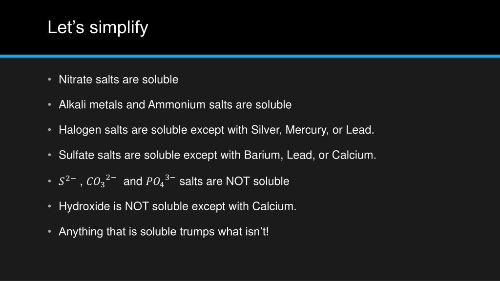 Let’s simplify • Nitrate salts are soluble • Alkali metals and Ammonium salts are soluble • Halogen salts are soluble except with Silver, Mercury, or Lead. • Sulfate salts are soluble except with Barium, Lead, or Calcium. • , and salts are NOT soluble • Hydroxide is NOT soluble except with Calcium. • Anything that is soluble trumps what isn’t!