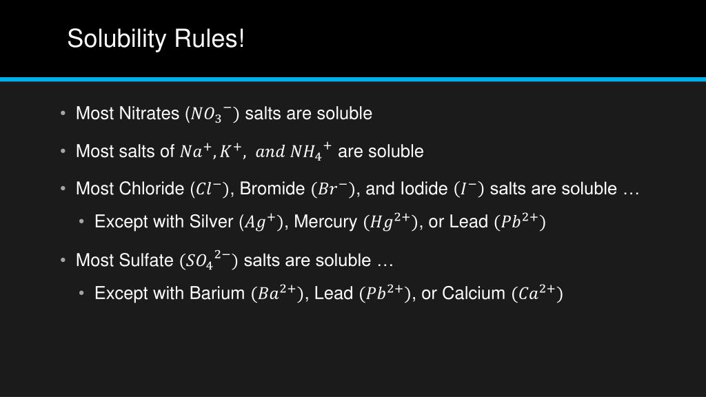 Solubility Rules! • Most Nitrates ( salts are soluble • Most salts of are soluble • Most Chloride (, Bromide , and Iodide salts are soluble … • Except with Silver (, Mercury , or Lead • Most Sulfate salts are soluble … • Except with Barium , Lead , or Calcium