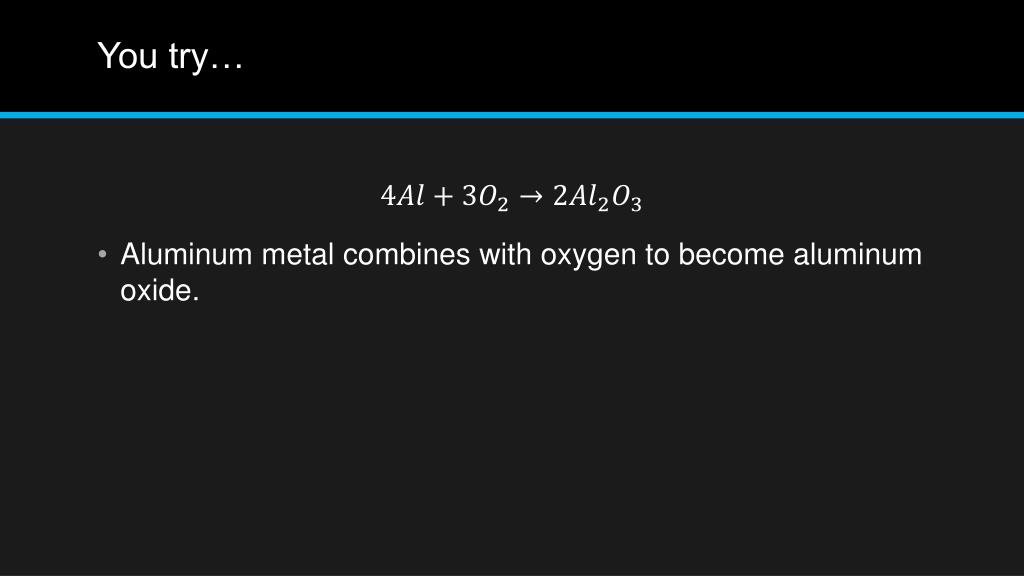 You try… • Aluminum metal combines with oxygen to become aluminum oxide.